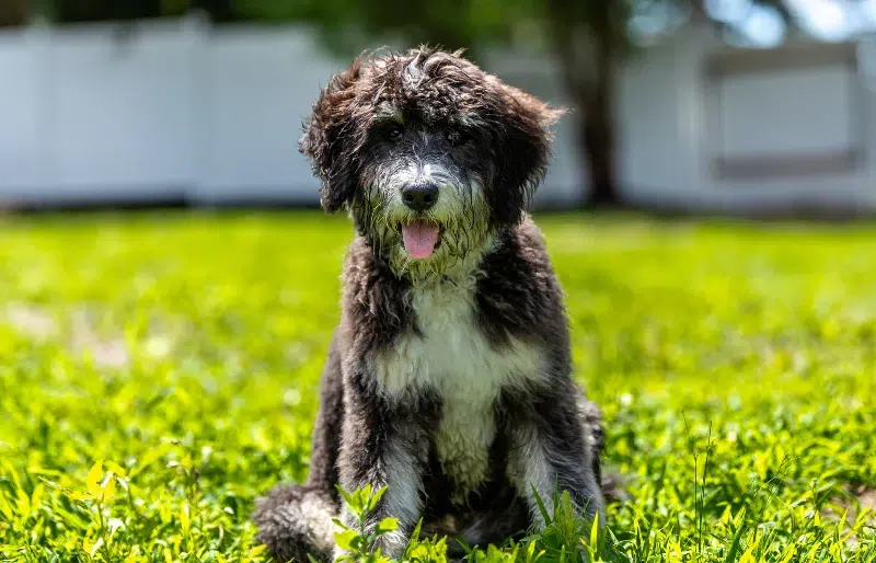 Bernedoodles have a well-balanced, athletic build with a fluffy, curly or wavy coat that gives them a soft and huggable appearance. They carry themselves with grace, yet have a playful and relaxed posture. Their unique markings and multicolored coat make them one of the most visually distinctive designer breeds.